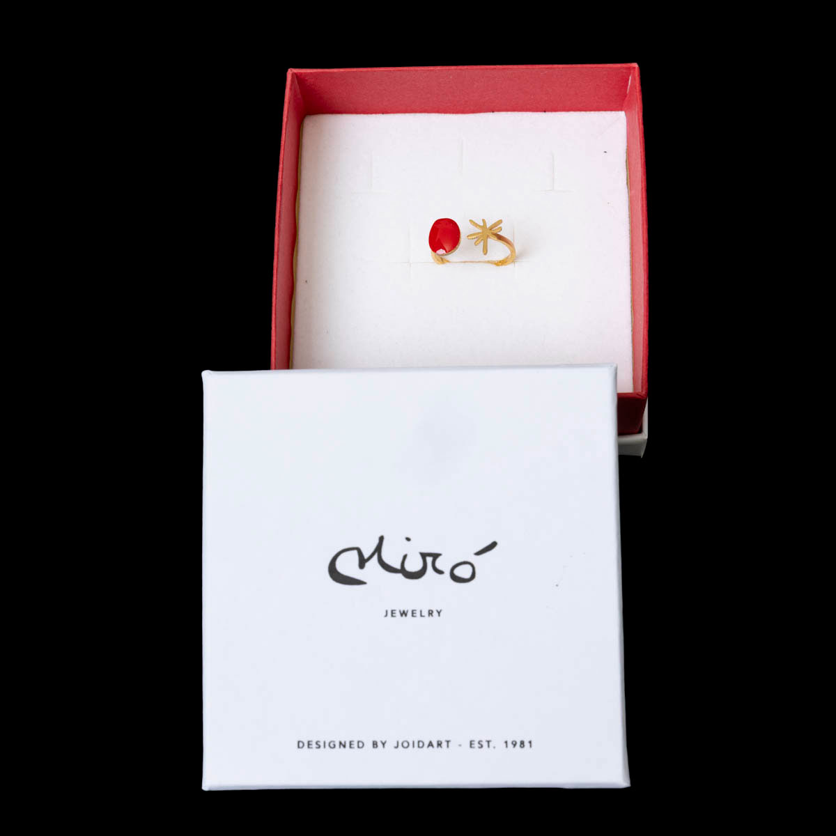 Anello ispirato a Joan Miró "Stella, sole rosso", dall'opera "Donna davanti al sole (1972)"