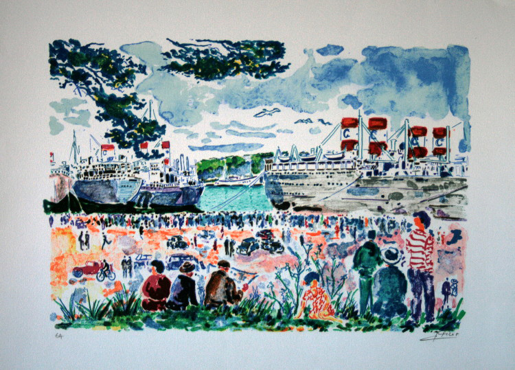 Litografía original firmada y numerada - Jean-Claude PICOT - Salida de los Transatlánticos