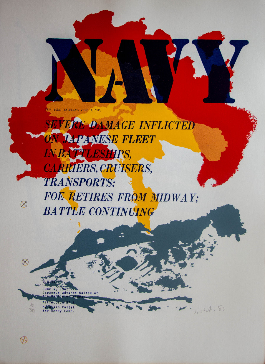 Former "war photographer," Alain Valtat naturally turned to screen printing, with a realistic eye and a fully artistic chromatic interpretation. Today a recognized sculptor, here he presents, through us, the full extent of his work in screen printing. From glimpses into his former life as a photographer, reinterpreting photographs from World War II in the Pacific, to a very personal perspective on sports, Alain Valtat offers us images of our time, our visual codes, and his colorful dreams. Grouped into themes, it is worth noting that the screen prints presented here are absolutely remarkable in terms of technique, as well as artistically harmonious.